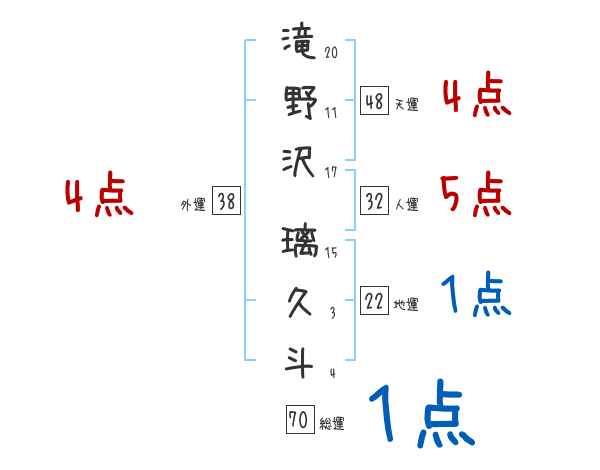 天運![]() | 滝野沢璃久斗さんの天運は48画の4つ星!賢明な性格で人望が厚い。指導力があり多くの人に尊敬される。 家系が持つ宿命的な運勢を表します。祖先から受け継いだ苗字ですので自分の力が及びません。家柄を象徴します。 |