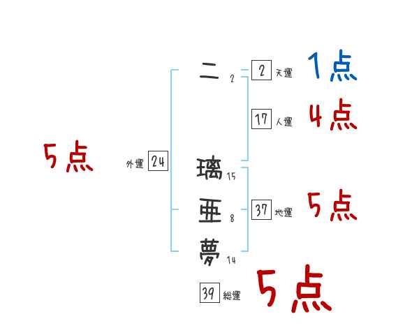総運![]() | 二璃亜夢さんの総運は39画の5つ星!社交性に優れ人望が厚い。人の上に立ち成功する。 あなたの人生を表す1番重要な運勢です。生涯を通じて影響する総合運となり、主に50歳以降の晩年期に影響を及ぼします。 |
