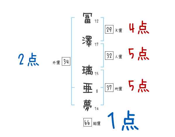 総運![]() | 冨澤璃亜夢さんの総運は66画の1つ星!迷うことが多く挫折しやすい傾向が。辛抱強く物事に取り組みましょう。 あなたの人生を表す1番重要な運勢です。生涯を通じて影響する総合運となり、主に50歳以降の晩年期に影響を及ぼします。 |