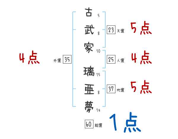 古武家璃亜夢さんの画数の鑑定結果