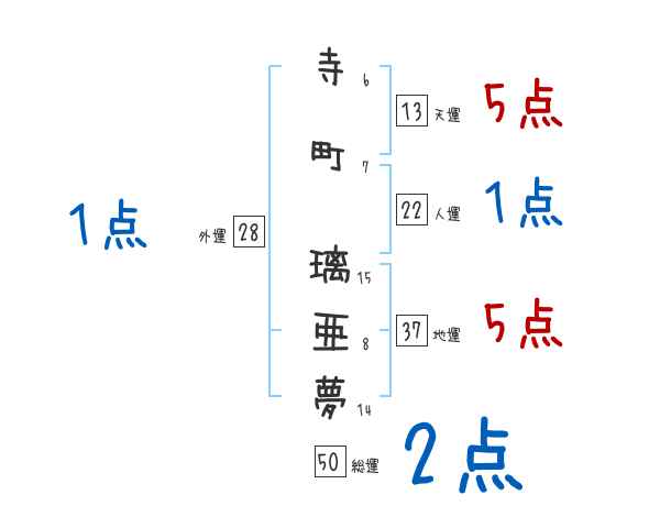 外運![]() | 寺町璃亜夢さんの外運は28画の1つ星!家庭環境に注意。スポーツで活躍できる能力があるかも。 生活面を象徴する運勢です。外部から受ける影響力を表し、結婚運、家庭運や職場、環境への順応性を表します。 |