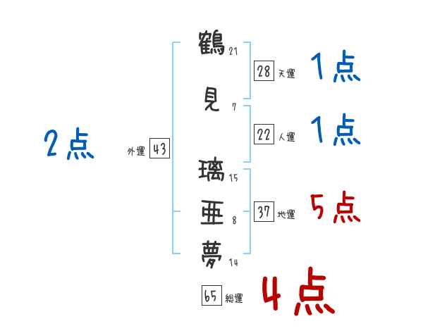 天運![]() | 鶴見璃亜夢さんの天運は28画の1つ星!家庭環境に注意。スポーツで活躍できる能力があるかも。 家系が持つ宿命的な運勢を表します。祖先から受け継いだ苗字ですので自分の力が及びません。家柄を象徴します。 |