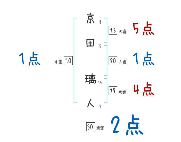 外運![]() | 京田璃人さんの外運は10画の1つ星!不安を感じやすい傾向。ストレスを抱えないように注意しましょう。 生活面を象徴する運勢です。外部から受ける影響力を表し、結婚運、家庭運や職場、環境への順応性を表します。 |