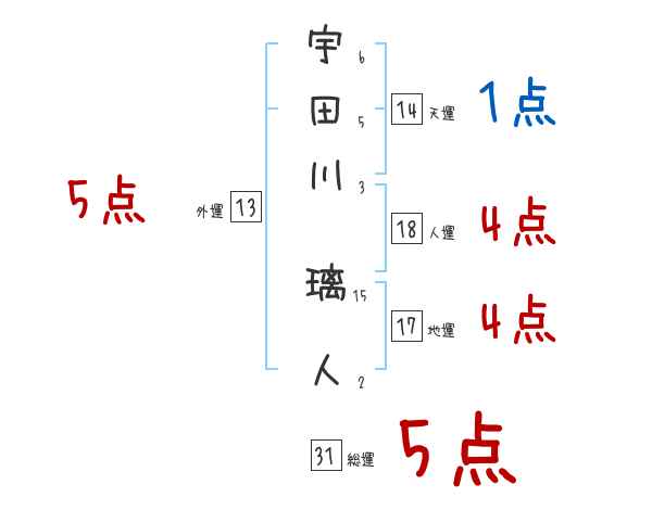 天運![]() | 宇田川璃人さんの天運は14画の1つ星!人に対して優しいがストレスを溜め込みがち。人間関係のトラブルを避けるよう気をつけましょう。 家系が持つ宿命的な運勢を表します。祖先から受け継いだ苗字ですので自分の力が及びません。家柄を象徴します。 |