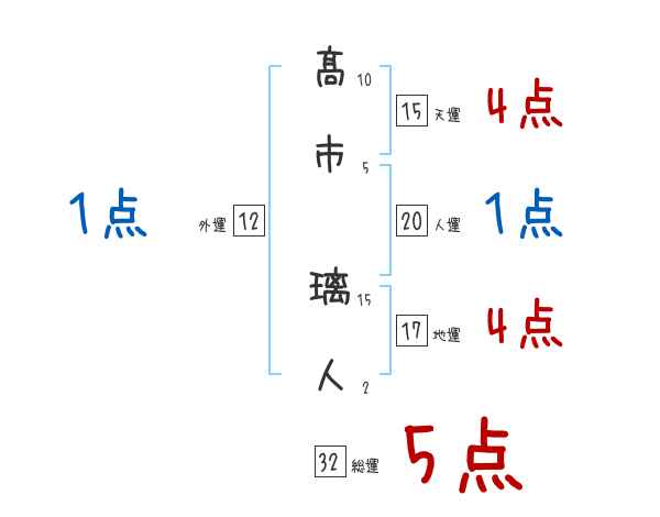 総運![]() | 髙市璃人さんの総運は32画の5つ星!柔軟性があり成功する。チャンスが多く金運が良い。 あなたの人生を表す1番重要な運勢です。生涯を通じて影響する総合運となり、主に50歳以降の晩年期に影響を及ぼします。 |