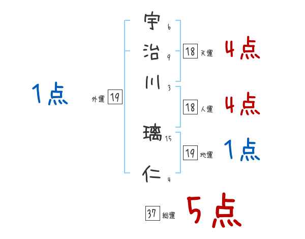 天運![]() | 宇治川璃仁さんの天運は18画の4つ星!情熱的で剛気。忍耐力があり信頼される。 家系が持つ宿命的な運勢を表します。祖先から受け継いだ苗字ですので自分の力が及びません。家柄を象徴します。 |