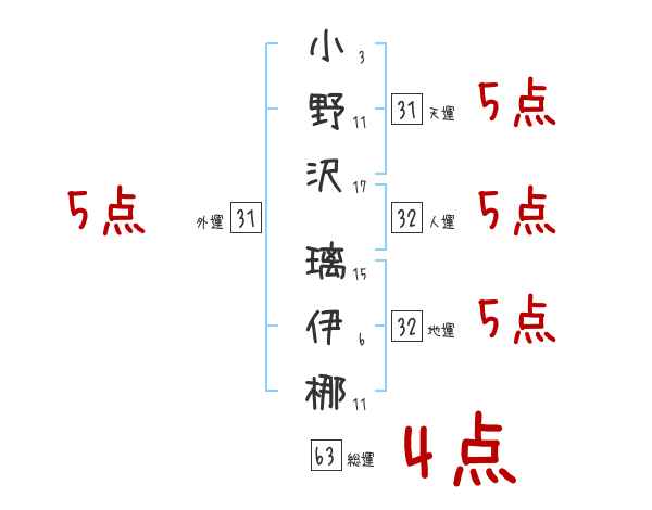 人運![]() | 小野沢璃伊梛さんの人運は32画の5つ星!柔軟性があり成功する。チャンスが多く金運が良い。 性格や才能などを表す2番目に重要な運勢です。人間関係や協調性、社会的な成功に影響します。主に20歳から50歳ぐらいまでの中年期の運勢を表します。 |
