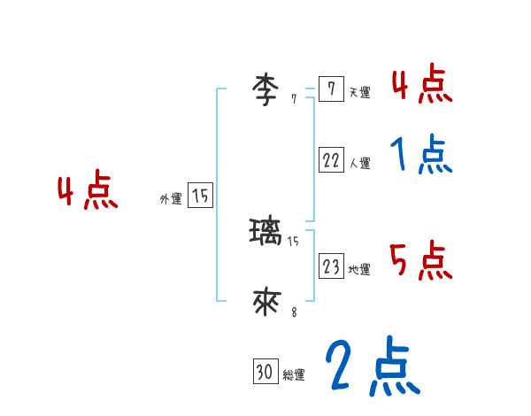 天運![]() | 李璃來さんの天運は7画の4つ星!強い意志や信念を持ち独立心が強い。自立する。 家系が持つ宿命的な運勢を表します。祖先から受け継いだ苗字ですので自分の力が及びません。家柄を象徴します。 |