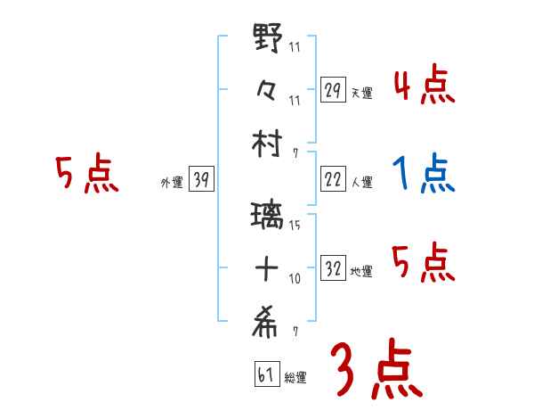 総運![]() | 野々村璃十希さんの総運は61画の3つ星!強情な性格でうぬぼれタイプ。自ら破滅する。 あなたの人生を表す1番重要な運勢です。生涯を通じて影響する総合運となり、主に50歳以降の晩年期に影響を及ぼします。 |