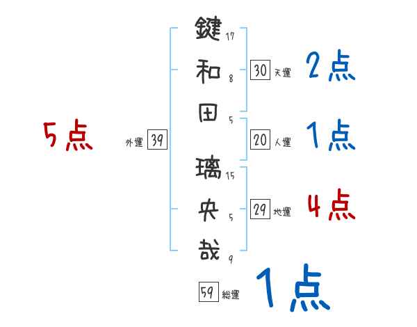 総運![]() | 鍵和田璃央哉さんの総運は59画の1つ星!意志の弱さであきらめることが多いかも。粘り強さが必要。 あなたの人生を表す1番重要な運勢です。生涯を通じて影響する総合運となり、主に50歳以降の晩年期に影響を及ぼします。 |