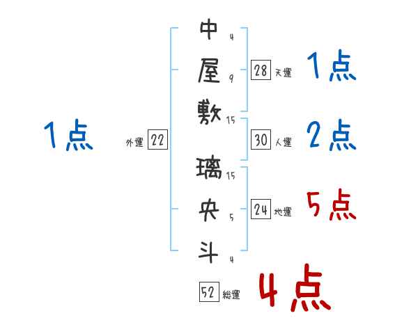 天運![]() | 中屋敷璃央斗さんの天運は28画の1つ星!家庭環境に注意。スポーツで活躍できる能力があるかも。 家系が持つ宿命的な運勢を表します。祖先から受け継いだ苗字ですので自分の力が及びません。家柄を象徴します。 |