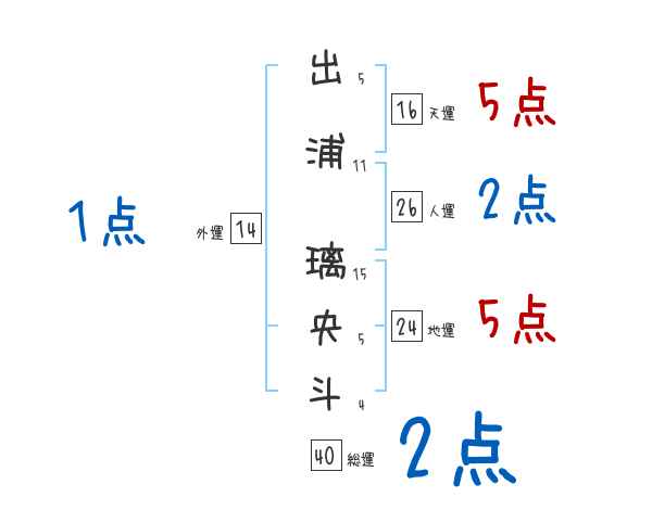 外運![]() | 出浦璃央斗さんの外運は14画の1つ星!人に対して優しいがストレスを溜め込みがち。人間関係のトラブルを避けるよう気をつけましょう。 生活面を象徴する運勢です。外部から受ける影響力を表し、結婚運、家庭運や職場、環境への順応性を表します。 |