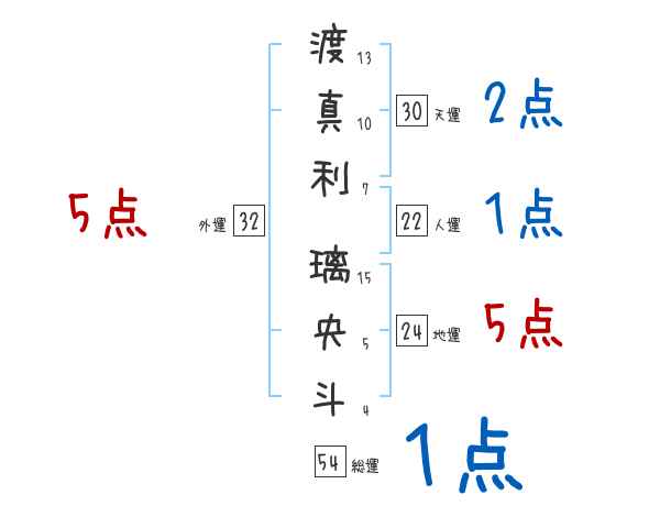 外運![]() | 渡真利璃央斗さんの外運は32画の5つ星!柔軟性があり成功する。チャンスが多く金運が良い。 生活面を象徴する運勢です。外部から受ける影響力を表し、結婚運、家庭運や職場、環境への順応性を表します。 |