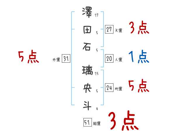 総運![]() | 澤田石璃央斗さんの総運は51画の3つ星!変化が激しく、危険に注意。堅実な性格。 あなたの人生を表す1番重要な運勢です。生涯を通じて影響する総合運となり、主に50歳以降の晩年期に影響を及ぼします。 |