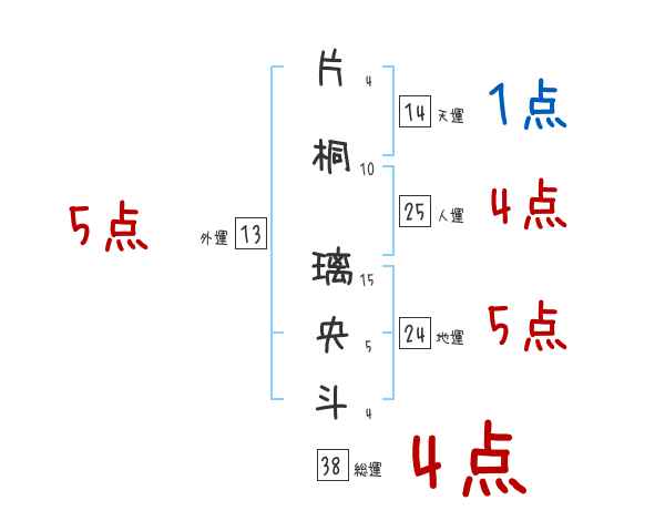 総運![]() | 片桐璃央斗さんの総運は38画の4つ星!温厚な性格で技術的な才能を発揮する。職人的な仕事に向いている。 あなたの人生を表す1番重要な運勢です。生涯を通じて影響する総合運となり、主に50歳以降の晩年期に影響を及ぼします。 |