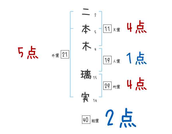 天運![]() | 二本木璃実さんの天運は11画の4つ星!着実に富や地位を得る幸運な人生。 家系が持つ宿命的な運勢を表します。祖先から受け継いだ苗字ですので自分の力が及びません。家柄を象徴します。 |