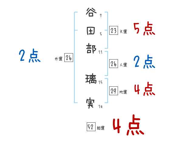 外運![]() | 谷田部璃実さんの外運は26画の2つ星!波瀾万丈かも。信頼できる人を大事にしましょう。 生活面を象徴する運勢です。外部から受ける影響力を表し、結婚運、家庭運や職場、環境への順応性を表します。 |