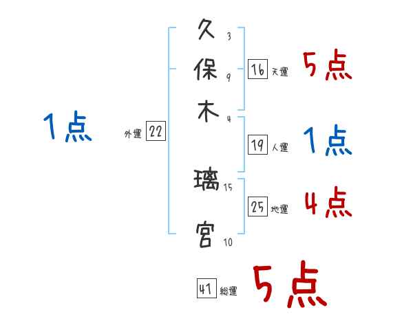天運![]() | 久保木璃宮さんの天運は16画の5つ星!人望が厚く大きく発展する。逆転成功が見える。 家系が持つ宿命的な運勢を表します。祖先から受け継いだ苗字ですので自分の力が及びません。家柄を象徴します。 |