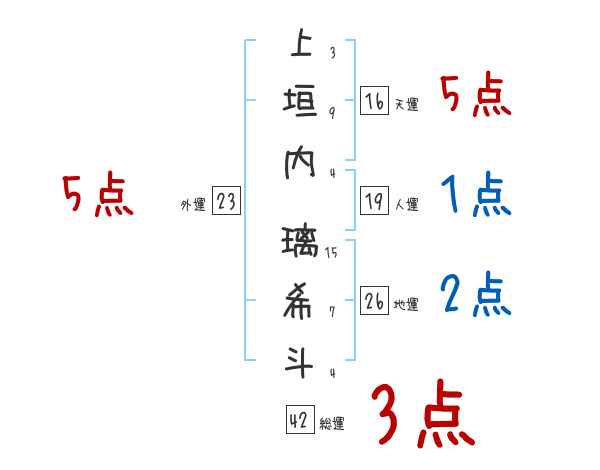 天運![]() | 上垣内璃希斗さんの天運は16画の5つ星!人望が厚く大きく発展する。逆転成功が見える。 家系が持つ宿命的な運勢を表します。祖先から受け継いだ苗字ですので自分の力が及びません。家柄を象徴します。 |