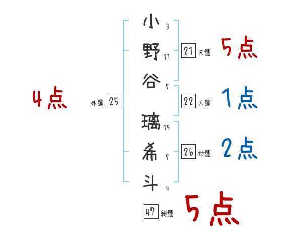 外運![]() | 小野谷璃希斗さんの外運は25画の4つ星!個性があり才能があふれる。強運の持ち主で発展する。 生活面を象徴する運勢です。外部から受ける影響力を表し、結婚運、家庭運や職場、環境への順応性を表します。 |