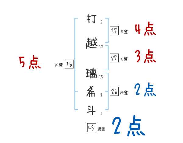 外運![]() | 打越璃希斗さんの外運は16画の5つ星!人望が厚く大きく発展する。逆転成功が見える。 生活面を象徴する運勢です。外部から受ける影響力を表し、結婚運、家庭運や職場、環境への順応性を表します。 |