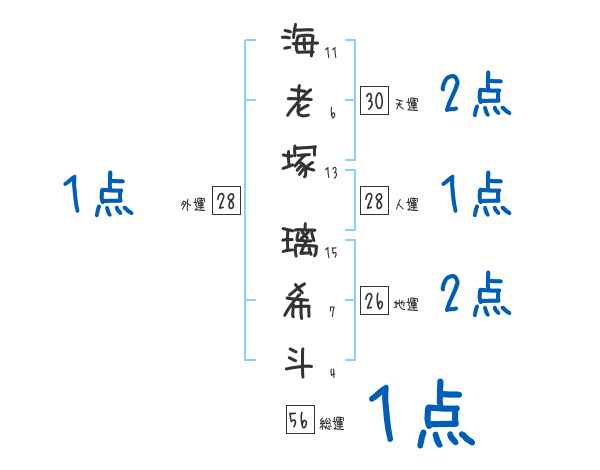 天運![]() | 海老塚璃希斗さんの天運は30画の2つ星!浮き沈みの激しさに注意しましょう。 家系が持つ宿命的な運勢を表します。祖先から受け継いだ苗字ですので自分の力が及びません。家柄を象徴します。 |