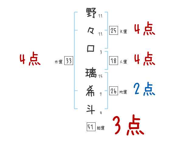 天運![]() | 野々口璃希斗さんの天運は25画の4つ星!個性があり才能があふれる。強運の持ち主で発展する。 家系が持つ宿命的な運勢を表します。祖先から受け継いだ苗字ですので自分の力が及びません。家柄を象徴します。 |