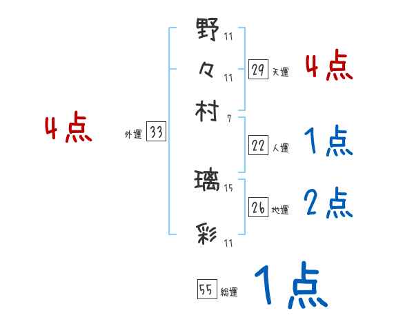 総運![]() | 野々村璃彩さんの総運は55画の1つ星!欲張りな性格で軽率な行動に注意しましょう。病気に気をつけて。 あなたの人生を表す1番重要な運勢です。生涯を通じて影響する総合運となり、主に50歳以降の晩年期に影響を及ぼします。 |