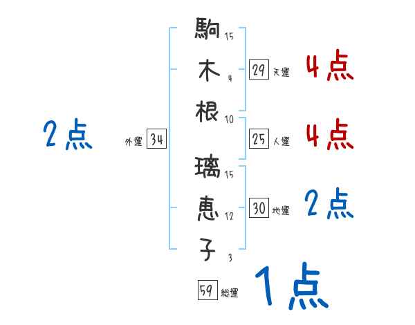 天運![]() | 駒木根璃恵子さんの天運は29画の4つ星!完全主義で才能がある。厳格な心の持ち主。 家系が持つ宿命的な運勢を表します。祖先から受け継いだ苗字ですので自分の力が及びません。家柄を象徴します。 |