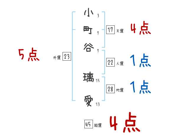 総運![]() | 小町谷璃愛さんの総運は45画の4つ星!もくもくと物事を進め達成する。地味な努力家。 あなたの人生を表す1番重要な運勢です。生涯を通じて影響する総合運となり、主に50歳以降の晩年期に影響を及ぼします。 |