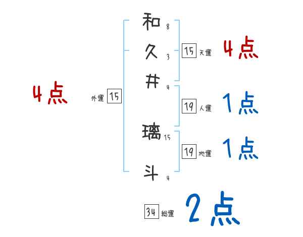 総運![]() | 和久井璃斗さんの総運は34画の2つ星!独創性に優れるが、自尊心が強く災難に注意しましょう。 あなたの人生を表す1番重要な運勢です。生涯を通じて影響する総合運となり、主に50歳以降の晩年期に影響を及ぼします。 |