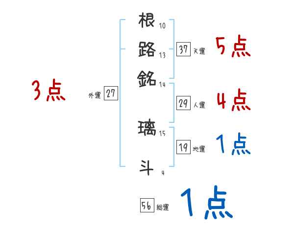 人運![]() | 根路銘璃斗さんの人運は29画の4つ星!完全主義で才能がある。厳格な心の持ち主。 性格や才能などを表す2番目に重要な運勢です。人間関係や協調性、社会的な成功に影響します。主に20歳から50歳ぐらいまでの中年期の運勢を表します。 |