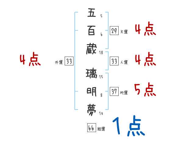 外運![]() | 五百蔵璃明夢さんの外運は33画の4つ星!権力志向でプライドが高い。勇気があり運を切り開き成功する。 生活面を象徴する運勢です。外部から受ける影響力を表し、結婚運、家庭運や職場、環境への順応性を表します。 |