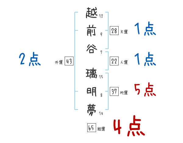 天運![]() | 越前谷璃明夢さんの天運は28画の1つ星!家庭環境に注意。スポーツで活躍できる能力があるかも。 家系が持つ宿命的な運勢を表します。祖先から受け継いだ苗字ですので自分の力が及びません。家柄を象徴します。 |