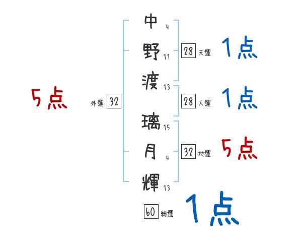 外運![]() | 中野渡璃月輝さんの外運は32画の5つ星!柔軟性があり成功する。チャンスが多く金運が良い。 生活面を象徴する運勢です。外部から受ける影響力を表し、結婚運、家庭運や職場、環境への順応性を表します。 |