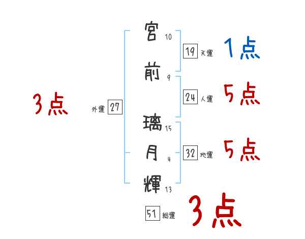 天運![]() | 宮前璃月輝さんの天運は19画の1つ星!優れた才能を持ちますが、協調性が足りないことも。周りの人と協力する事を意識しましょう。 家系が持つ宿命的な運勢を表します。祖先から受け継いだ苗字ですので自分の力が及びません。家柄を象徴します。 |