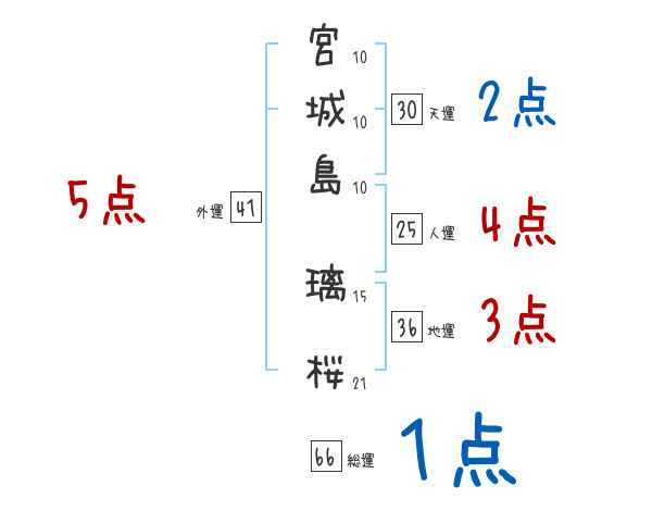 天運![]() | 宮城島璃桜さんの天運は30画の2つ星!浮き沈みの激しさに注意しましょう。 家系が持つ宿命的な運勢を表します。祖先から受け継いだ苗字ですので自分の力が及びません。家柄を象徴します。 |