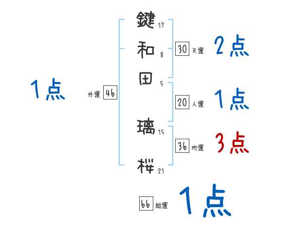 天運![]() | 鍵和田璃桜さんの天運は30画の2つ星!浮き沈みの激しさに注意しましょう。 家系が持つ宿命的な運勢を表します。祖先から受け継いだ苗字ですので自分の力が及びません。家柄を象徴します。 |
