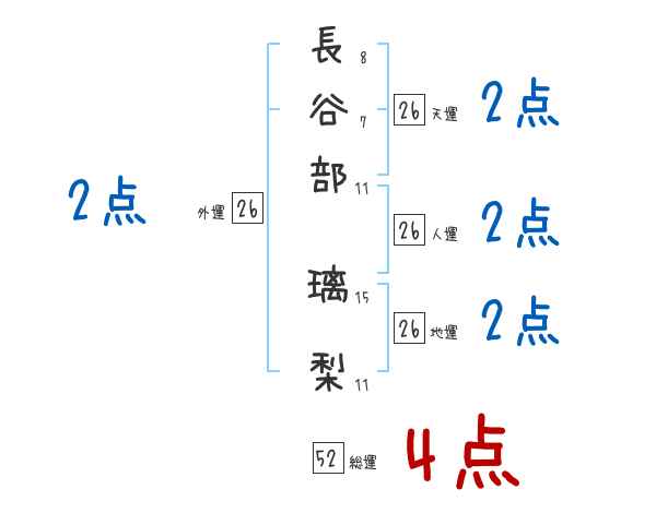地運![]() | 長谷部璃梨さんの地運は26画の2つ星!波瀾万丈かも。信頼できる人を大事にしましょう。 個性を表す基礎的な運勢です。性格形成や対人関係、行動力など家庭環境に影響されます。主に誕生してから20歳くらいまでの若年期の運勢を表します。 |
