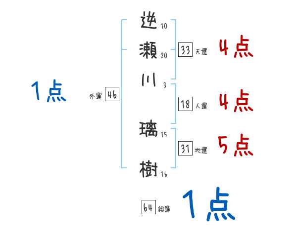 天運![]() | 逆瀬川璃樹さんの天運は33画の4つ星!権力志向でプライドが高い。勇気があり運を切り開き成功する。 家系が持つ宿命的な運勢を表します。祖先から受け継いだ苗字ですので自分の力が及びません。家柄を象徴します。 |