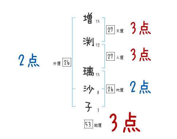 天運![]() | 増渕璃沙子さんの天運は27画の3つ星!頭脳明晰だが強情で摩擦が多い傾向。孤立に注意。 家系が持つ宿命的な運勢を表します。祖先から受け継いだ苗字ですので自分の力が及びません。家柄を象徴します。 |