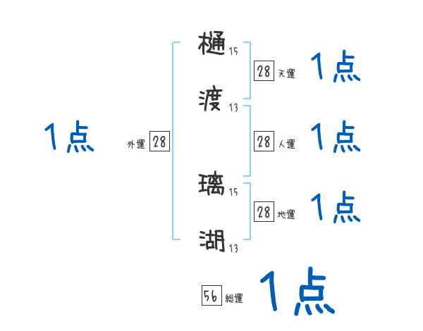 天運![]() | 樋渡璃湖さんの天運は28画の1つ星!家庭環境に注意。スポーツで活躍できる能力があるかも。 家系が持つ宿命的な運勢を表します。祖先から受け継いだ苗字ですので自分の力が及びません。家柄を象徴します。 |