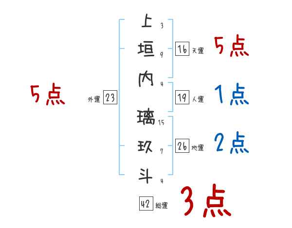 外運![]() | 上垣内璃玖斗さんの外運は23画の5つ星!想像力に優れ活力がある。一代で成功し名誉を手に入れる。 生活面を象徴する運勢です。外部から受ける影響力を表し、結婚運、家庭運や職場、環境への順応性を表します。 |