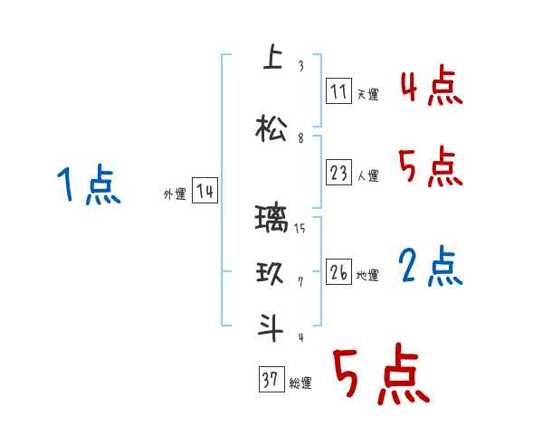 | 天運  | 上松璃玖斗さんの天運は11画の4つ星!着実に富や地位を得る幸運な人生。家系が持つ宿命的な運勢を表します。祖先から受け継いだ苗字ですので自分の力が及びません。家柄を象徴します。 |