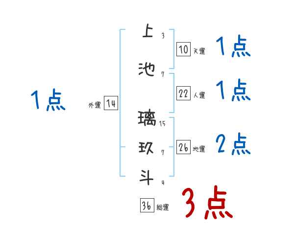 総運![]() | 上池璃玖斗さんの総運は36画の3つ星!先見性が豊かです。多少神経質で苦労することも。 あなたの人生を表す1番重要な運勢です。生涯を通じて影響する総合運となり、主に50歳以降の晩年期に影響を及ぼします。 |