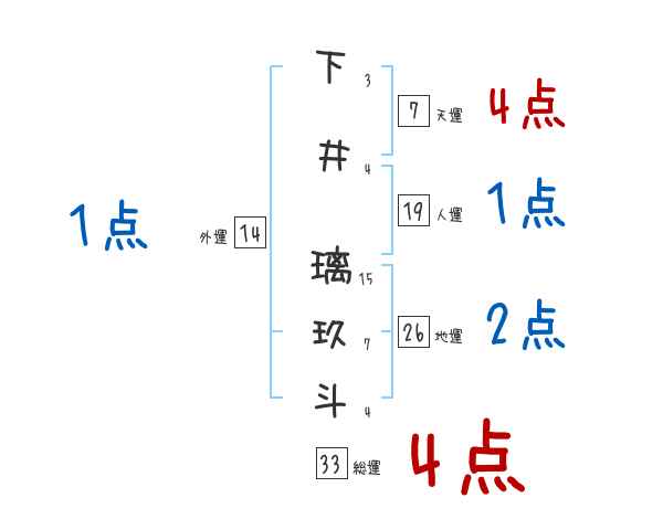 天運![]() | 下井璃玖斗さんの天運は7画の4つ星!強い意志や信念を持ち独立心が強い。自立する。 家系が持つ宿命的な運勢を表します。祖先から受け継いだ苗字ですので自分の力が及びません。家柄を象徴します。 |