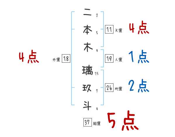 天運![]() | 二本木璃玖斗さんの天運は11画の4つ星!着実に富や地位を得る幸運な人生。 家系が持つ宿命的な運勢を表します。祖先から受け継いだ苗字ですので自分の力が及びません。家柄を象徴します。 |