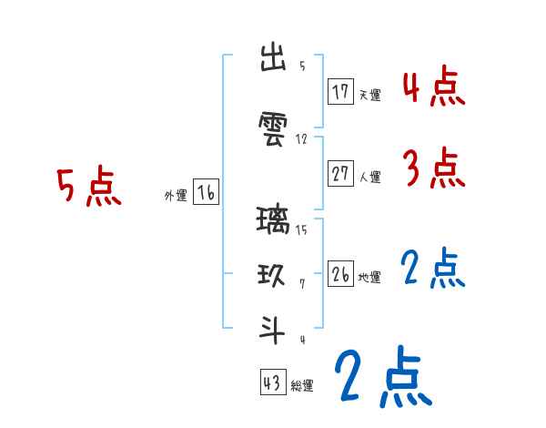 外運![]() | 出雲璃玖斗さんの外運は16画の5つ星!人望が厚く大きく発展する。逆転成功が見える。 生活面を象徴する運勢です。外部から受ける影響力を表し、結婚運、家庭運や職場、環境への順応性を表します。 |