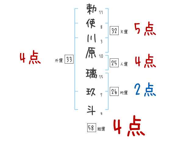 天運![]() | 勅使川原璃玖斗さんの天運は32画の5つ星!柔軟性があり成功する。チャンスが多く金運が良い。 家系が持つ宿命的な運勢を表します。祖先から受け継いだ苗字ですので自分の力が及びません。家柄を象徴します。 |
