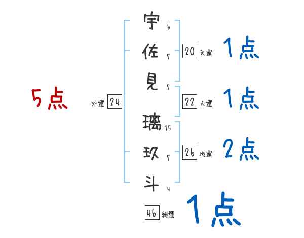 地運![]() | 宇佐見璃玖斗さんの地運は26画の2つ星!波瀾万丈かも。信頼できる人を大事にしましょう。 個性を表す基礎的な運勢です。性格形成や対人関係、行動力など家庭環境に影響されます。主に誕生してから20歳くらいまでの若年期の運勢を表します。 |